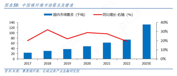 2022年我国碳纤维市场需求中,国产/进口碳纤维分别为4.5/2.9万吨,国产碳纤维供应量首次超过进口量。2022年我国碳纤维进口依赖度为39.5%,同比下降13.6%。根据《2022全球碳纤维复合材料市场报告》,预计到2025年中国碳纤维市场需求为13.22万吨,进口依赖度将降低至16.2%。