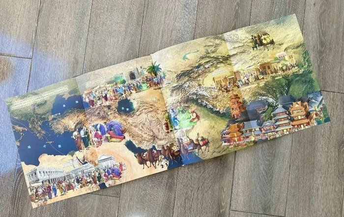 今天山海风物市集为大家带来的历史书,是一套综合了上面几个特点的带地图的历史科普绘本——《藏在地图里的中国历史》。精致的外壳,让人眼前一亮,质感极好,8开的大画幅极具审美,1米长的大拉页足够震撼。