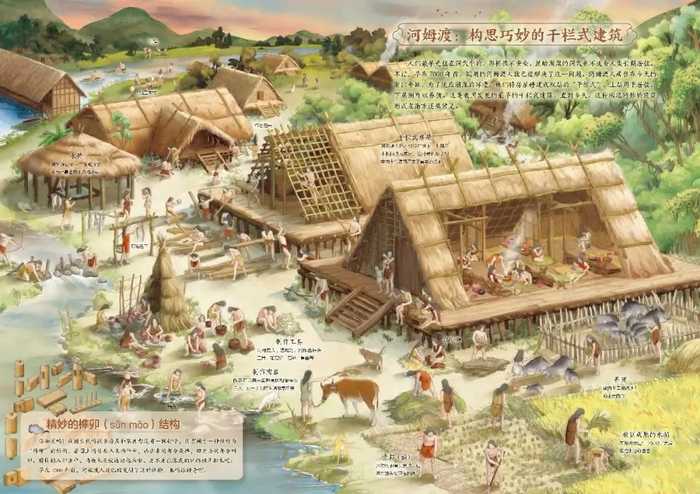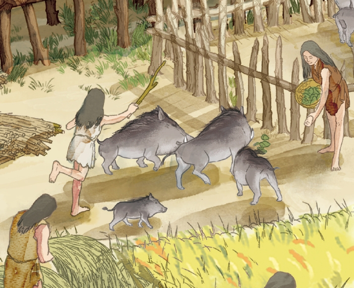 图画里的各种细节,也是经过一再推敲,反复修改,力求接近历史的真相。下面这个河姆渡人驯化养猪的图片,原始家猪和现代家猪的体型有着非常大的差别,插画师在绘图过程中,不仅参考了河姆渡出土的与猪相关的文物,还查阅了大量古代猪类驯化起源的文献,几经易稿才确定下来。