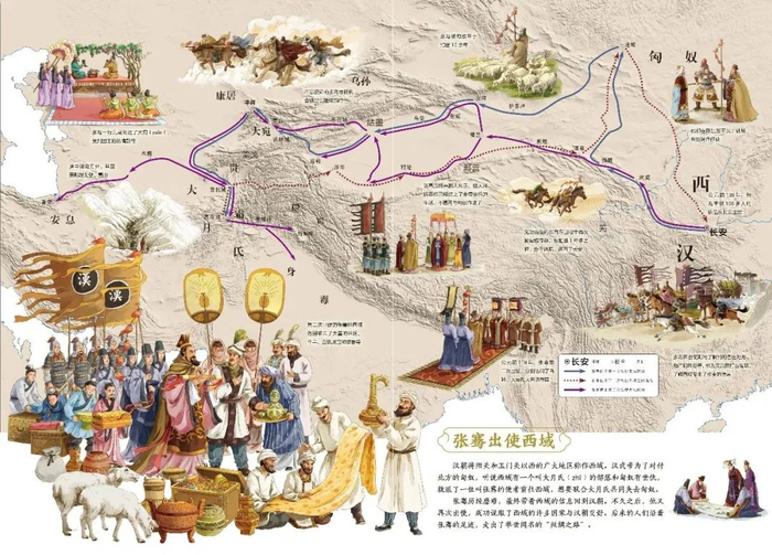 再比如丝绸之路,在这套书中,不仅完整地呈现了张骞两次出访西域,开通丝绸之路的故事,还清楚地展示了丝绸之路的起点和终点、一路上的重要城镇、商贩贩卖的货物,以及丝路对今天生活的影响和改变。