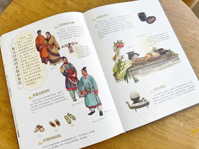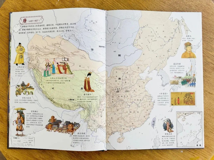 在这套书里,从史前文明一直到清朝,每个朝代都有一张历史疆域图,清清楚楚地标着当时的边界和今天的国界,可以对比着看。上面还有一些图片和简单的文字,记载了这个朝代的一些大事件,一目了然。