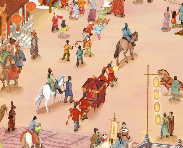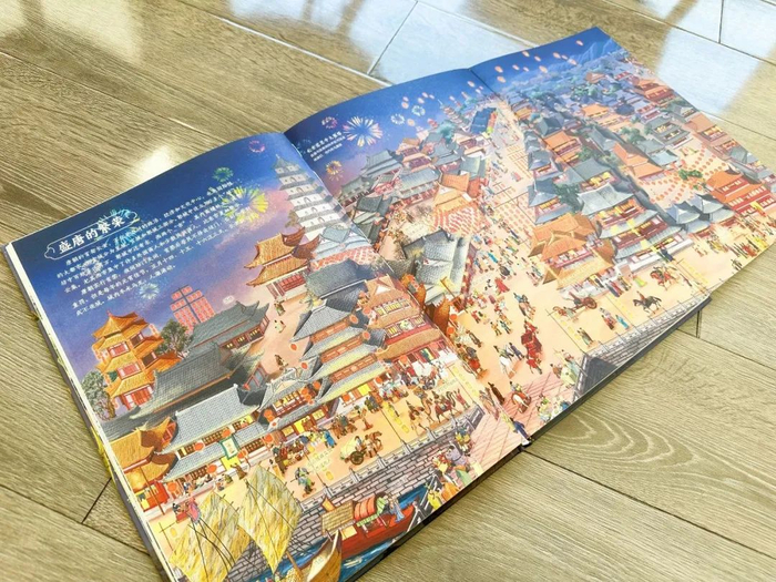 说到历史绘本,不得不赞一下这套书的插画,实在太逼真太美丽了。展开的盛唐的繁荣拉页,画的是灯火长安不夜天的壮观街景。长安是唐朝的首都,平时会实行宵禁,一到晚上,坊门关闭之后,居民就不能随意外出了。只有在每年的元宵佳节,长安才会变成不夜城,城内车水马龙,人群涌动。