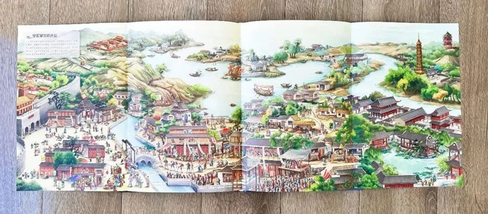 再看明朝的南京城。南京是江南地区的政治、经济和文化中心,也是全国性的商业城市,非常地繁荣。插画师在创作这幅画时,不仅阅读了大量的文献资料,还参考了明朝画家仇英的《南都繁会图》,可以说尽量还原当时的情景。这幅图打开之后足足有1米长,江南的春景扑面而来。