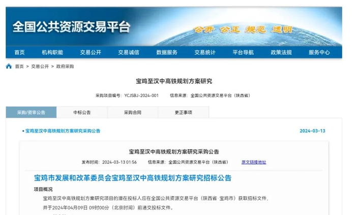 备受关注的宝汉高铁有新进展了。日前,在全国公共资源交易平台上,宝鸡市发展和改革委员会发布了《宝鸡至汉中高铁规划方案研究招标公告》,正式启动项目前期研究工作,招标预算300万元。