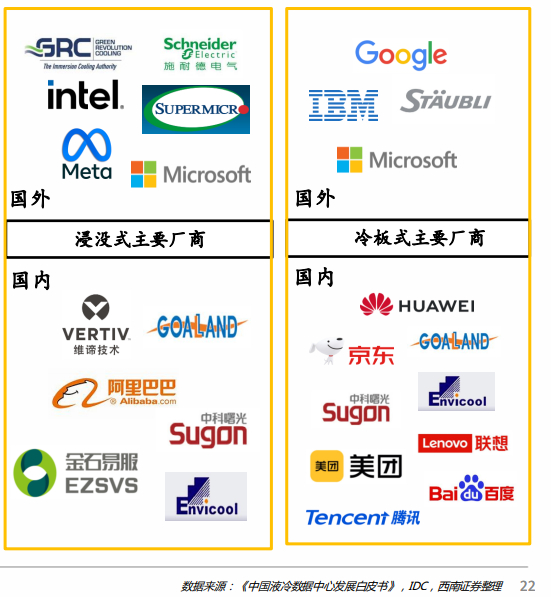 目前国内液冷服务器厂商主要包括华为、曙光数创、神威蓝光、浪潮信息、新华三(紫光股份)等,海外液冷服务器厂商包括戴尔、惠普、思科、SGI、BULL、Cray、富士康、超微、Nortech(浪潮合作)、Iceotop等。