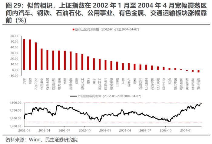 高度注重实物工作量的经济增长模式带来资源消耗加快,彼时供给端约束并不强硬的上游依然展现出了较高的价格弹性,产业链利润占比同样抬升。然而在经济快速增长,“蛋糕”不断被做大的年代里,全产业链利润实现扩张,投资者目光往往聚焦于当时市场空间广阔,渗透率低,微观增速高的环节,而对于产业链利润分配的格局容易忽视。体现在资本市场上,上证指数在2002年1月至2004年4月宽幅震荡区间内涨幅靠前的板块中,生产建设制造活动是重要线索,其中石油石化、有色金属等上游资源板块涨幅靠前,公用事业+交通运输等基础设施行业表现优秀,这两者恰好映射当下“红利投资”的主要行业,而汽车(合资车进入)、电力设备等中下游高景气板块同样表现出色。