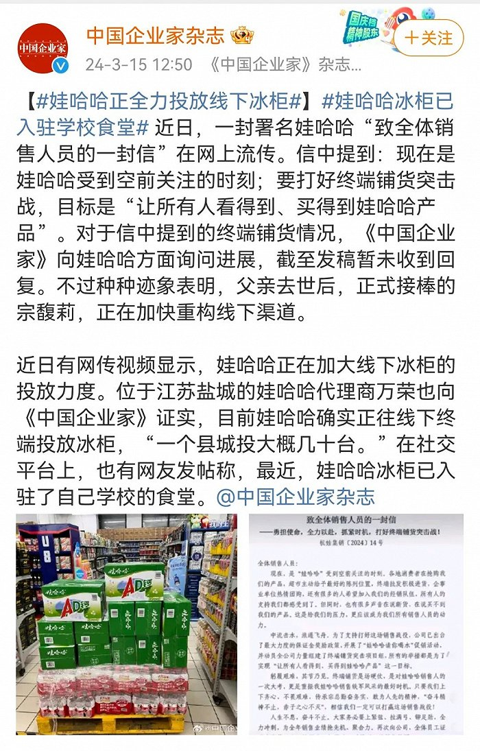 这背后正是宗馥莉目前在力推的线下渠道重构计划。网络视频显示,娃哈哈正在加大线下冰柜的投放力度,意图通过增加产品曝光率来提升销量。要知道之前大家看到更多的还是农夫山泉红色冰柜,一位位于江苏盐城的娃哈哈代理商证实了这一消息,他表示目前娃哈哈正积极向线下终端投放冰柜,每个县城投放数量达几十台之多。在社交平台上,也有网友发帖称,最近,娃哈哈冰柜已入驻了自己学校的食堂。