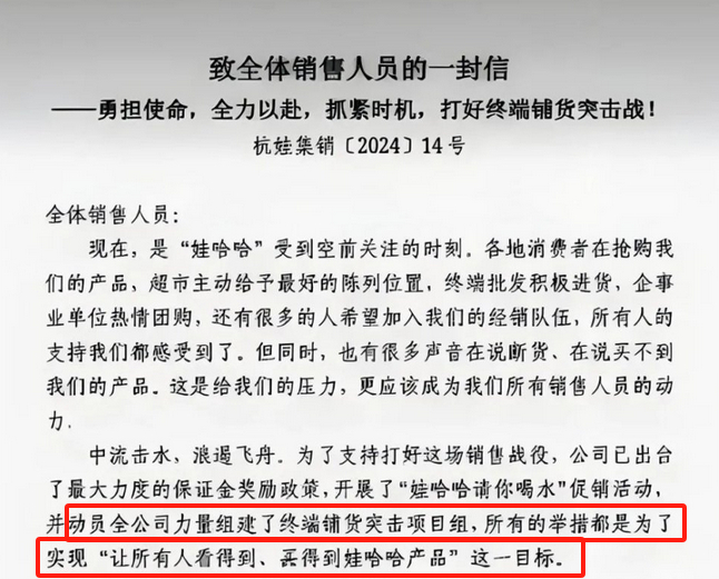除了线上,线下娃哈哈产品也超级抢手。前不久,一封署名娃哈哈“致全体销售人员的一封信”在网上被曝光。信中专门提到娃哈哈被抢断货的情况,并称“现在是娃哈哈受到空前关注的时刻”;要打好终端铺货突击战,目标是“让所有人看得到、买得到娃哈哈产品”。