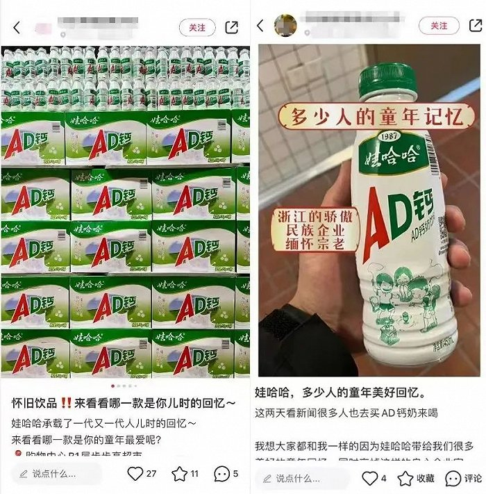 在线下更是,有不少网友表示,自己随便走进一家超市,老板都会把娃哈哈放在了一进门最显眼位置,货架上娃哈哈AD钙奶、营养快线等,基本都被抢购一空,不少货架上只放着一瓶产品作为展示,标签写着“暂时缺货”。与此同时,以前从没见过的娃哈哈产品,比如娃哈哈的无糖茶、咖啡以及各种口味的营养快线均被上架。