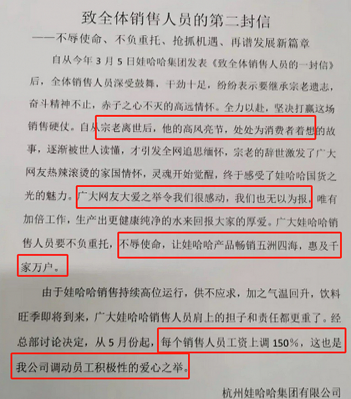 随后,正式接手娃哈哈的宗馥莉对所有参与一线生产发货的员工进行奖励,称3月15前对所有生产分公司(含精机)员工进行500元/人的一次性生产发货奖励,对各部门员工协助配合生产发货的进行300元/人的一次性生产发货奖励。没几天,宗馥莉又给销售团队发出第二封信。这一次,不只是发奖金鼓舞干劲,还宣布了涨工资——5月份起,娃哈哈销售人员工资上调150%。