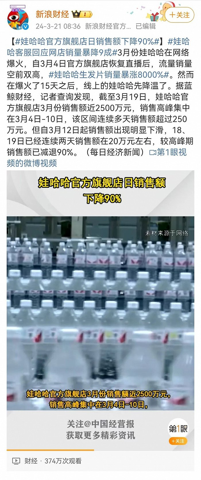 3月20日,“娃哈哈旗舰店日销额下降90%”词条登上热搜,其实这很正常。在经历18、19日已经连续两天销售额在20万元的娃哈哈卖空了货。娃哈哈官方旗舰店客服也称,现在只有预售商品,会不定时补货。