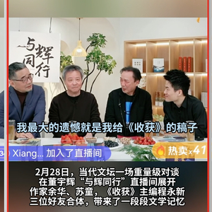 董子琪:鲁青所说的草根形象,让我想起在董宇辉对谈余华、苏童和程永新的时候,也是把作家的故事转述为他们从籍籍无名、一无所有开始奋斗的过程,强调他们是通过一篇一篇地写才走到了今天家喻户晓的位置。董宇辉把这套叙事套用到很多访谈当中,或许这样让听众更加能够与作家建立连接。对于想要写作的文学青年、在基层从事各种普通工作的人、心怀着文学梦的广大人群,董宇辉的叙述有很强的情感召唤力。