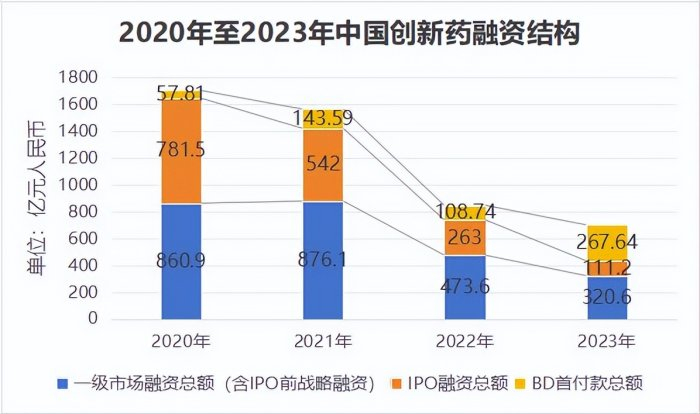 另外,值得一提的是,当前资本市场对于创新药投资情绪不高的情况较为显著。据浙商证券统计,2023年中国创新药领域一级市场融资总额(含IPO前战略融资)是320.6亿元,IPO融资总额是111.2亿元,这两个数字均低于2022年的473.6亿元、263亿元。