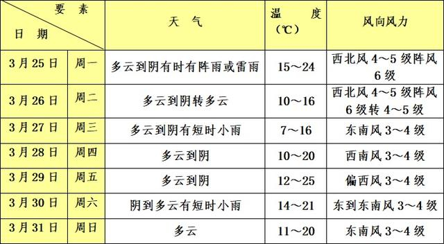 下周一白天暖意不减,仍有阵性降水。傍晚到夜里北方冷空气开始影响,同时派发一次大风和降温过程。周二降雨停止,最高气温降至16℃。初春时节,建议大家还是要留一两件厚外套,及时增减。下周中后期天气相对较好,只有27日和30日小雨匆匆快闪。气温上升趋势不变,最高气温逐步回升至20℃以上。