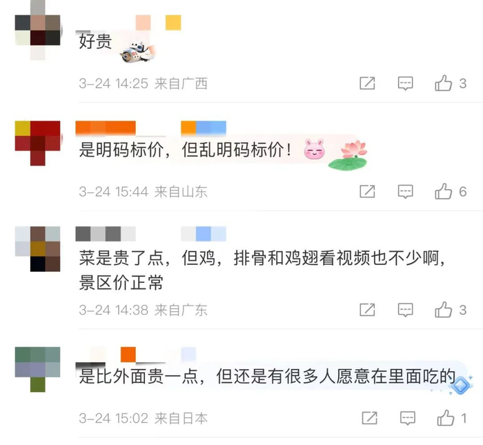 网友纷纷留言:表示确实贵;也有人表示理解,虽然贵一点但食材份量大,景区价格正常……