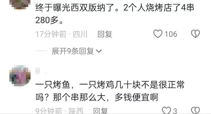 有网友发出不同的声音,这5个烤串并不是常见的蔬菜串,而是烤鱼,烤鸡。一个烤鸡卖四五十元完全合理,因此,5个烤串卖170元应该很合理。