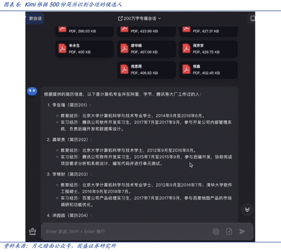 例如,公司HR可以基于业务需求,快速从最近的500份简历中,让Kimi快速找出有某个行业从业经历,同时从计算机类专业毕业的求职者,更加高效地筛选和识别合适的候选人。
