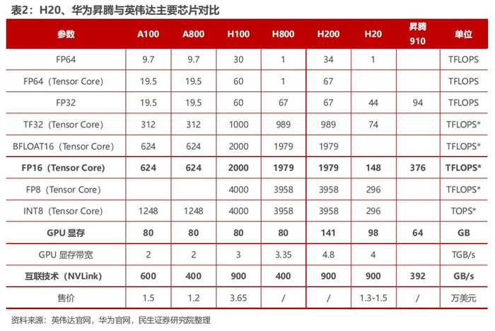 H20供应在即,仍是大模型训练/推理重要底座。根据《科创板日报》2月27日新闻,从产业链人士处了解到,英伟达对华“特供版”AI芯片H20将在今年的英伟达GTC 2024大会(3月18日-3月21日)开完之后,全面接受预订,最快四周可以供货。根据英伟达官网、华为官网的公开资料,我们将英伟达H20与历代英伟达GPU以及华为昇腾系列进行对比,在算力层面由于贸易禁令的限制,H20相较于昇腾系列相比差距较大,但是在现存、互联技术等性能的加持下,H20在组成集群后的能力较为突出,仍是大模型训练的重要底座。在整体AI算力基础设施加大投资建设的背景下,英伟达H20以及国产算力芯片均有望实现突破。