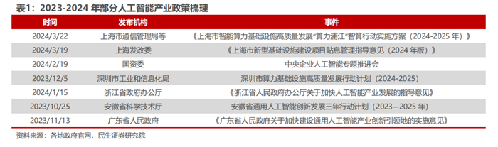 各地算力基础设施政策纷纷发布,响应人工智能产业浪潮。我们对近期各地发布的人工智能产业政策进行梳理,在各项文件中算力都作为重点环节被写入政府文件,算力建设得到高层的空前重视。