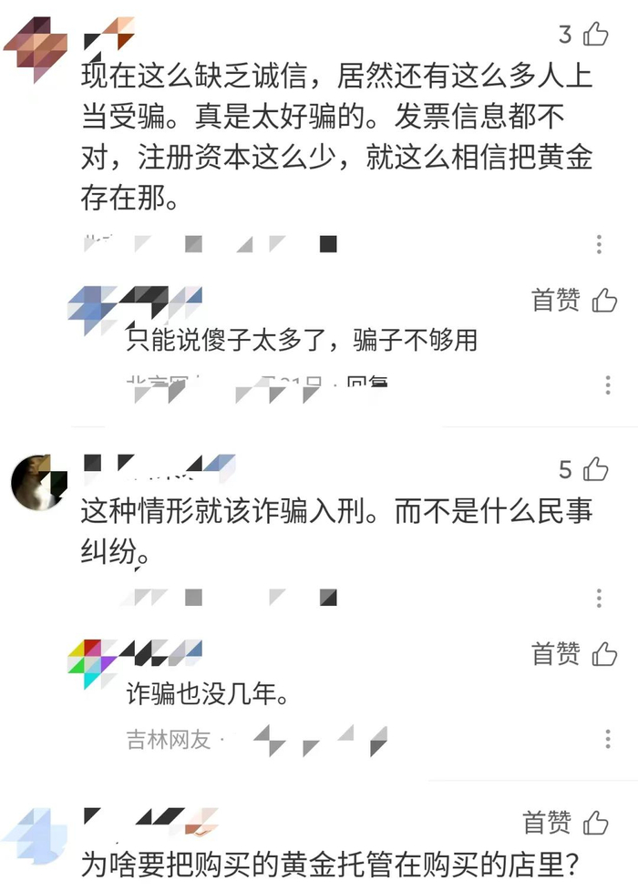 针对此事,网友热议:“金店也跑路?还能信什么啊”“中国黄金必须担责,买的时候认的就是中国黄金,谁还去辨别什么加盟店概念店啊,认的就是中国黄金作为国企的牌子和公信力”。