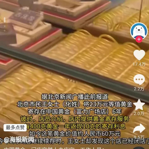 据了解,涉事门店经营黄金“托管”业务,消费者由此可享受一些优惠和利息。有受害人表示,在同中国黄金工作人员沟通时,对方以涉事店铺为加盟店为由“矢口否认”相关责任。