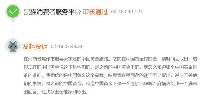 无独有偶,今年2月18日,也有消费者在黑猫投诉称,中国黄金存在定金预售及存金跑路问题。