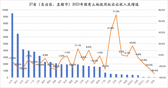 从增速来看,只有天津、河北、内蒙古、吉林、重庆5个省份实现正增长。其中,吉林省2023年卖地收入同比大增71.4%。