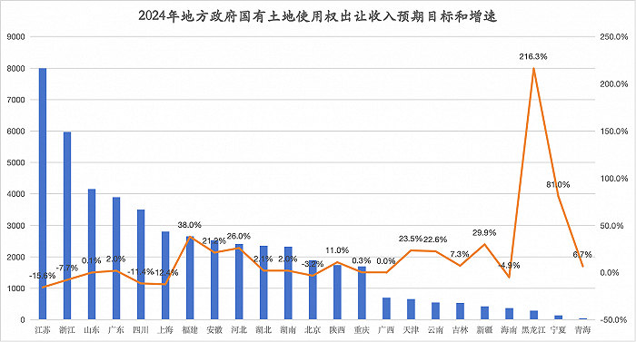 卖地收入位居全国首位的江苏省预计,2024年国有土地使用权出让收入为8000亿元,较2023年目标调低了1000亿元,比2023年实际执行数下降15.6%。江苏省在预算报告中称,房地产市场预期尚不稳定,涉房涉地税收增收难度大,土地出让收入中可调入一般公共预算统筹的资金将大幅减少。