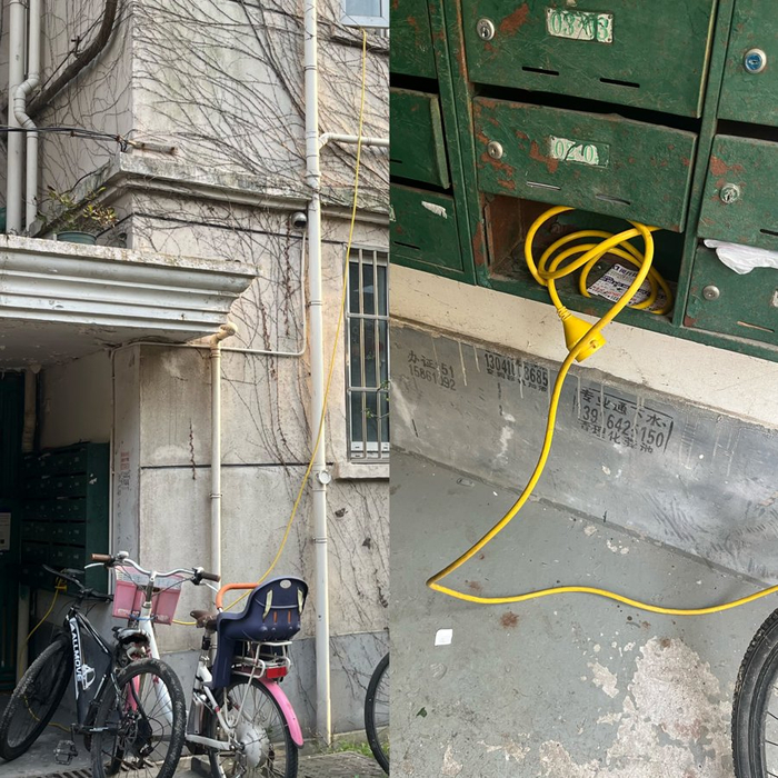 不过,绕到小区最北侧的楼前,记者发现了些端倪。此处的黄色“飞线”比其他线缆要更粗些,成色较新,在密布爬山虎的墙面上格外显眼,线缆末端则团了几圈,塞进了楼下的信箱里。记者走近一看,该电线末端是个闭口的圆锥体,没有插电口。这难道就是新能源车的充电头?记者上楼敲开了对应的房门,开门的是一位中年妇女,她承认飞线的确是从自己家中接下去的,但怎么充、为何如此设置等详情她并不了解,称要去咨询女儿。