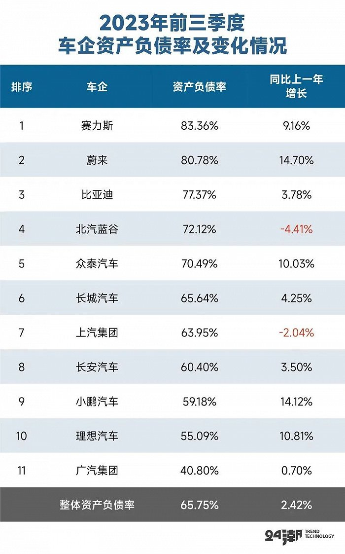 1.11家车企整体资产负债率为65.75%,同比增长了2.42个百分点,其中5家企业资产负债率在70%以上,依次为赛力斯(83.336%)、蔚来(80.78%)、比亚迪(77.37%)、北汽蓝谷(72.12%)、众泰汽车(70.49%);