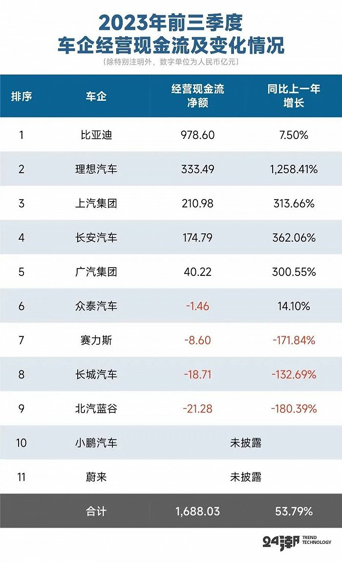 2.9家企业经营现金流净额合计1688.03亿元,同比增长53.79%,其中长城汽车、赛里斯、北汽蓝谷等车企的经营现金流都明显恶化(注小鹏汽车与蔚来未披露现金流数据);