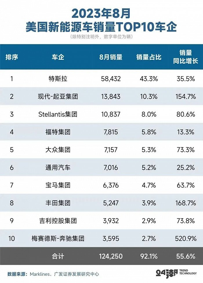 以美国2023年8月份新能源汽车市场为例,美国新能源汽车销量TOP10企业销量合计为12.43万辆,同比增长55.6%,占据了92.1%的市场份额,其中只有吉利1家中资车企,仅占据2.9%的市场份额。