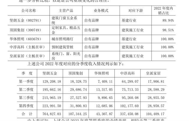 但记者注意到,2023年前三季度,上述公司的业绩也并未如大艺科技一样出现大幅增长。2023年前三季度坚朗五金、顶固集创的营业收入分别同比增长2.6%、20.50%。而据皇派家居招股说明书,2023年1-9月,公司实现营业收入7.1亿元,较上年同期下滑8.50%。