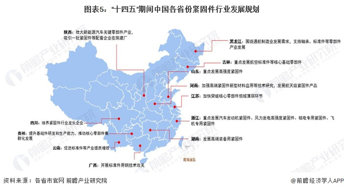 “十四五”期间,我国有十余个省份提出了紧固件行业发展规划,其中吉林、黑龙江、山东、浙江、湖南等省份明确提出要围绕风力发电、新能源汽车、核电、航空航天等新兴产业发展高端紧固件产品,而陕西、四川、贵州、云南、广西等地紧固件产业基础较为薄弱,着力于培养紧固件龙头企业、发展紧固件用材料。