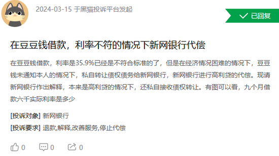 还有投诉者表示,在本人不知情的情况下,新网银行借款利率高达35.9%。
