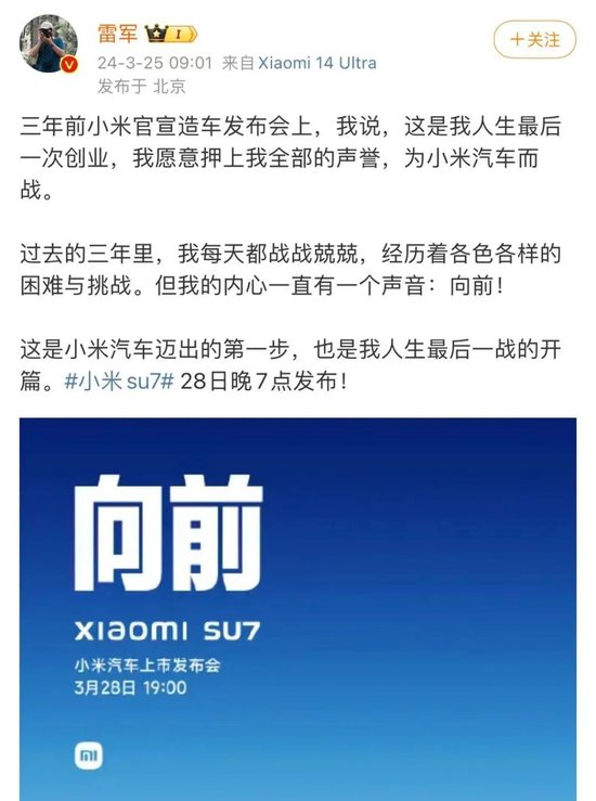 消息面上,小米董事长兼CEO雷军今日发布微博称,小米SU7将于28日晚7点发布,今天开始在全国29城静态品鉴。雷军在微博中表示,小米SU7的目标是50万元以内最好看、最好开、最智能的轿车。他也坦言:“这是小米汽车迈出的第一步,也是我人生最后一战的开篇。”目前,小米汽车App已上架了苹果App Store。该应用支持iOS 13.0或更高版本的iPhone手机使用。