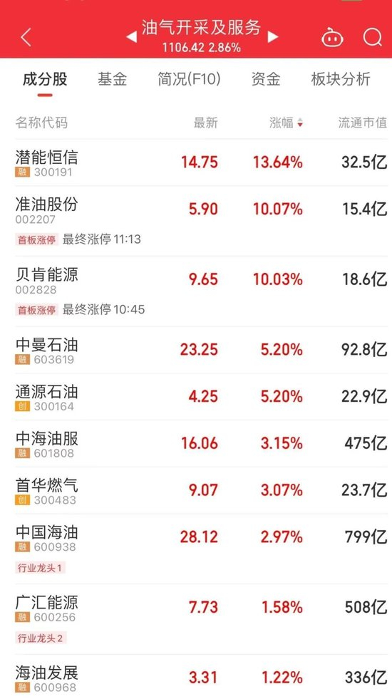 今日盘中,油气开采及服务板块领涨,准油股份、贝肯能源涨停,中曼石油、通源石油跟涨。