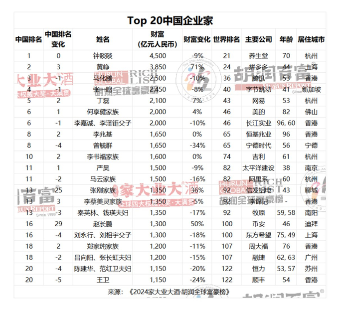 2024胡润富豪榜:钟睒睒身价4500亿元蝉联中国首富