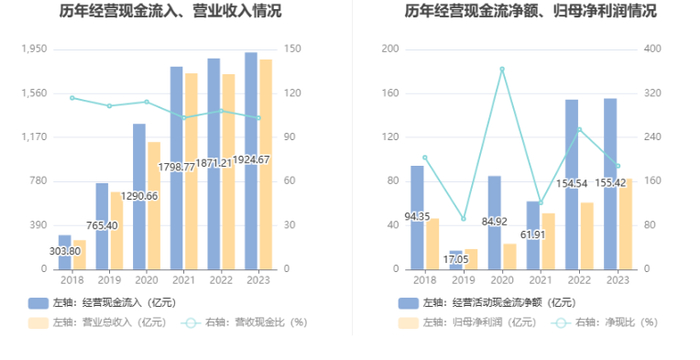 2023年,公司营业收入现金比为103.33%,净现比为188.39%。