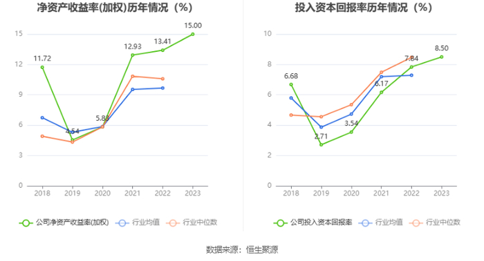 数据显示,2023年公司加权平均净资产收益率为15.00%,较上年同期增长1.59个百分点;公司2023年投入资本回报率为8.50%,较上年同期增长0.66个百分点。