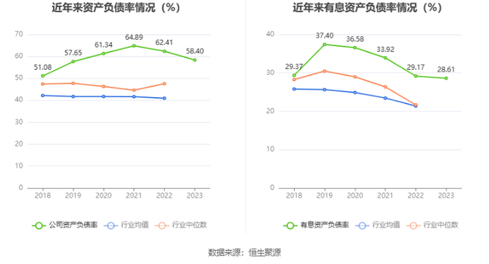 在偿债能力方面,公司2023年年末资产负债率为58.40%,相比上年末下降4.01个百分点;有息资产负债率为28.61%,相比上年末下降0.56个百分点。