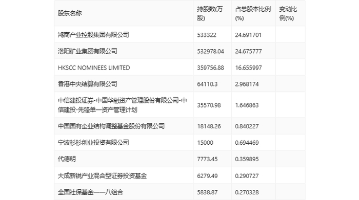年报显示,2023年年末公司十大流通股东中,持股最多的为鸿商产业控股集团有限公司,占比24.69%。十大流通股东名单相比2023年三季报维持不变。在具体持股比例上,HKSCC NOMINEES LIMITED、全国社保基金一一八组合持股有所上升,香港中央结算有限公司、中信建投证券-中国华融资产管理股份有限公司-中信建投-先锋单一资产管理计划持股有所下降。
