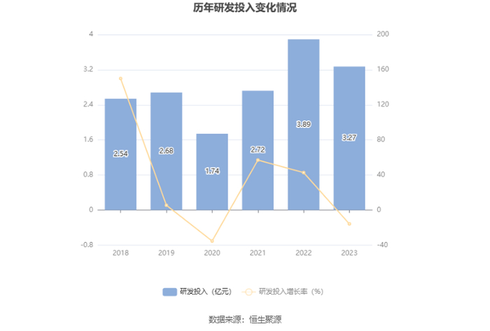 2023年全年,公司研发投入金额为3.27亿元,同比下降15.83%;研发投入占营业收入比例为0.18%,相比上年同期下降0.04个百分点。此外,公司全年研发投入资本化率为0。