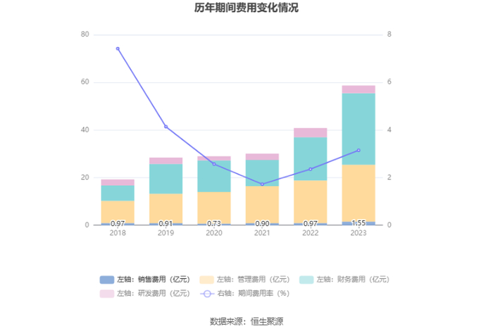 2023年,公司期间费用为58.73亿元,较上年同期增加17.88亿元;期间费用率为3.15%,较上年同期上升0.79个百分点。其中,销售费用同比增长59.94%,管理费用同比增长33.27%,研发费用同比下降15.83%,财务费用同比增长66.1%。