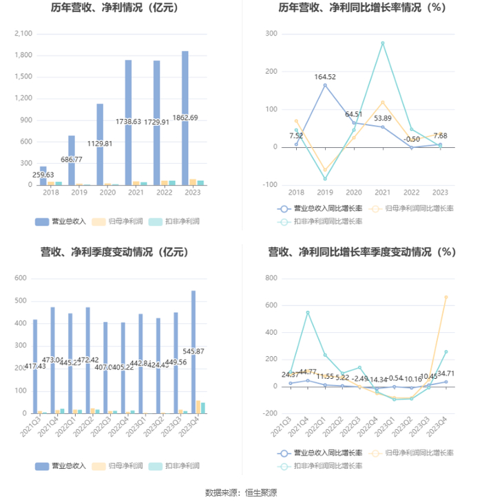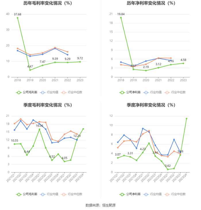 2023年,公司毛利率为9.72%,同比上升0.43个百分点;净利率为4.58%,较上年同期上升0.42个百分点。从单季度指标来看,2023年第四季度公司毛利率为16.23%,同比上升9.42个百分点,环比上升3.94个百分点;净利率为11.46%,较上年同期上升9.08个百分点,较上一季度上升7.77个百分点。