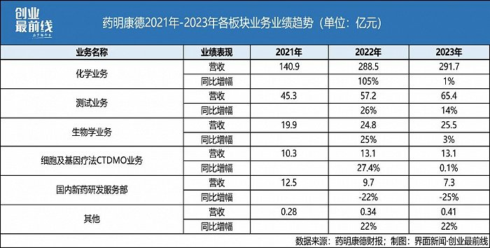 其中,化学板块增速由2022年的105%降至2023年的1%,测试业务增速由26%降至14%,生物学业务由25%降至3%。国内新药研发服务部业务板块营收更是连续两年下滑。