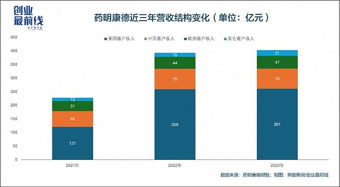 从区域来看,美国市场是药明康德的营收主力,其营收由2021年的121亿元增长至2023年的261亿元,营收占比也由2021年的53%提升至2023年的65%。