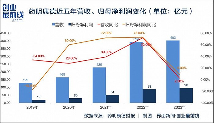 从近五年来看,药明康德业绩呈现逐年增长态势。具体来看,2023年,药明康德营收403亿元,是2019年的3倍;归母净利润96亿元,是2019年的5倍。