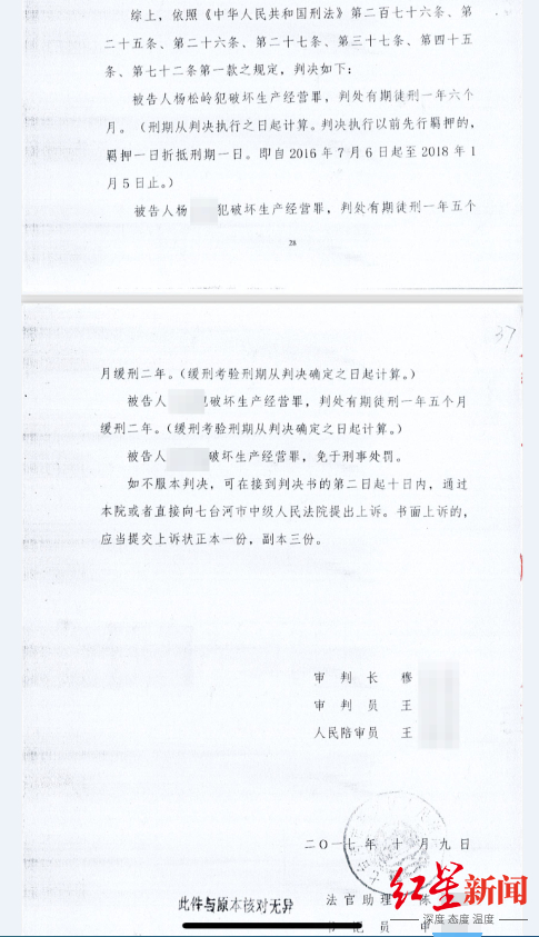 2017年10月9日,新兴区法院作出一审判决,以破坏生产经营罪判处杨松岭有期徒刑一年六个月,其余人也各自获刑或定罪免罚。