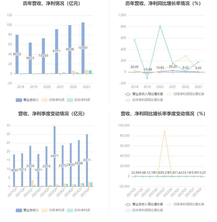 2023年,公司毛利率为18.44%,同比上升3.75个百分点;净利率为7.29%,较上年同期上升0.93个百分点。从单季度指标来看,2023年第四季度公司毛利率为19.42%,同比上升5.05个百分点,环比上升0.54个百分点;净利率为8.73%,较上年同期上升4.53个百分点,较上一季度上升1.18个百分点。